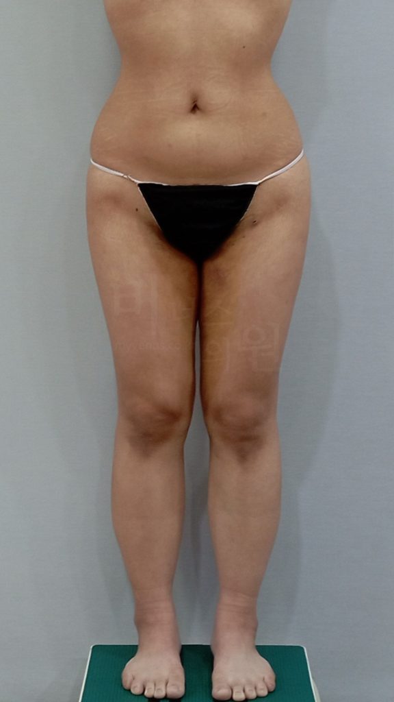 정면에서 촬영한 전후사진입니다. 복부와 하체 전면 실루엣의 변화를 확인할 수 있습니다.