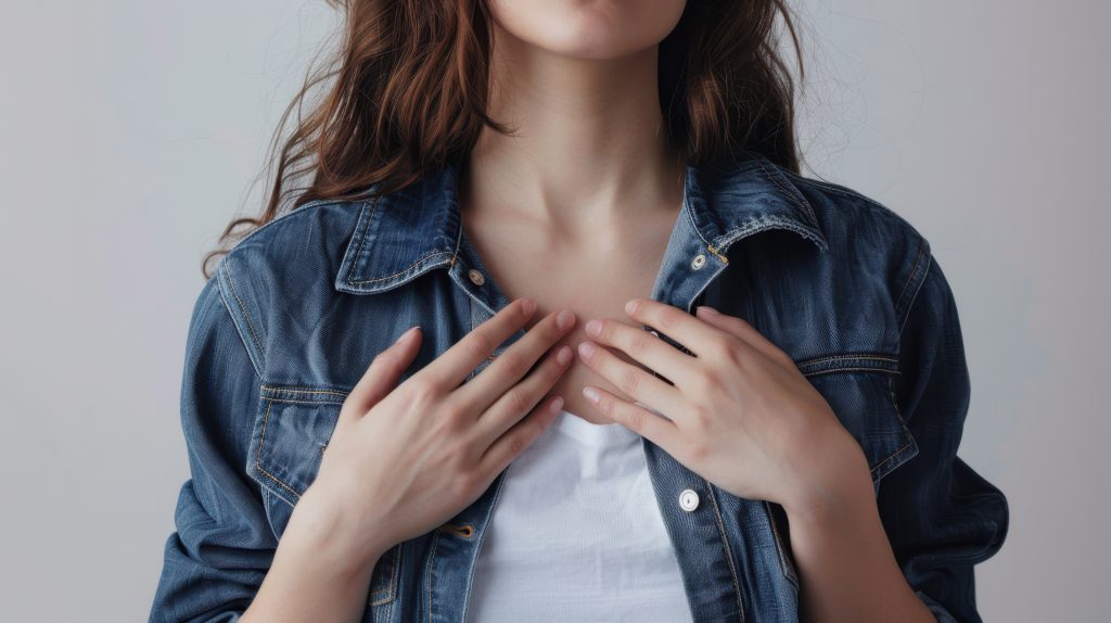 - 여름철 피부 트러블: 가슴 하방의 피부가 지속적으로 자극을 받고 통기가 어렵기 때문에, 특히 여름철에 피부염이 잘 발생합니다. 땀이 차거나 마찰이 반복되면서 피부가 손상되기 쉬운 환경이 됩니다.